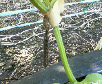 なんとカメムシがヨトウ虫を捕食(吸引?)していて、ヨトウがすでに1/4程度吸われてしまっていました。