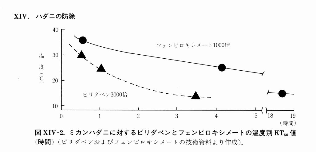 「高温(30℃以上?)ではどっちでも良いけど、低温下ではフェンピロ(商品名:ダニトロン)じゃー抑制ぐらいにしかならないよ」って読むのかね。でも最初っからピリダベン(同:サンマイト)の方が性能良くね?
