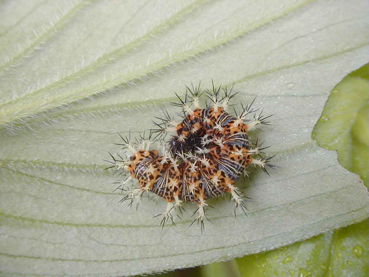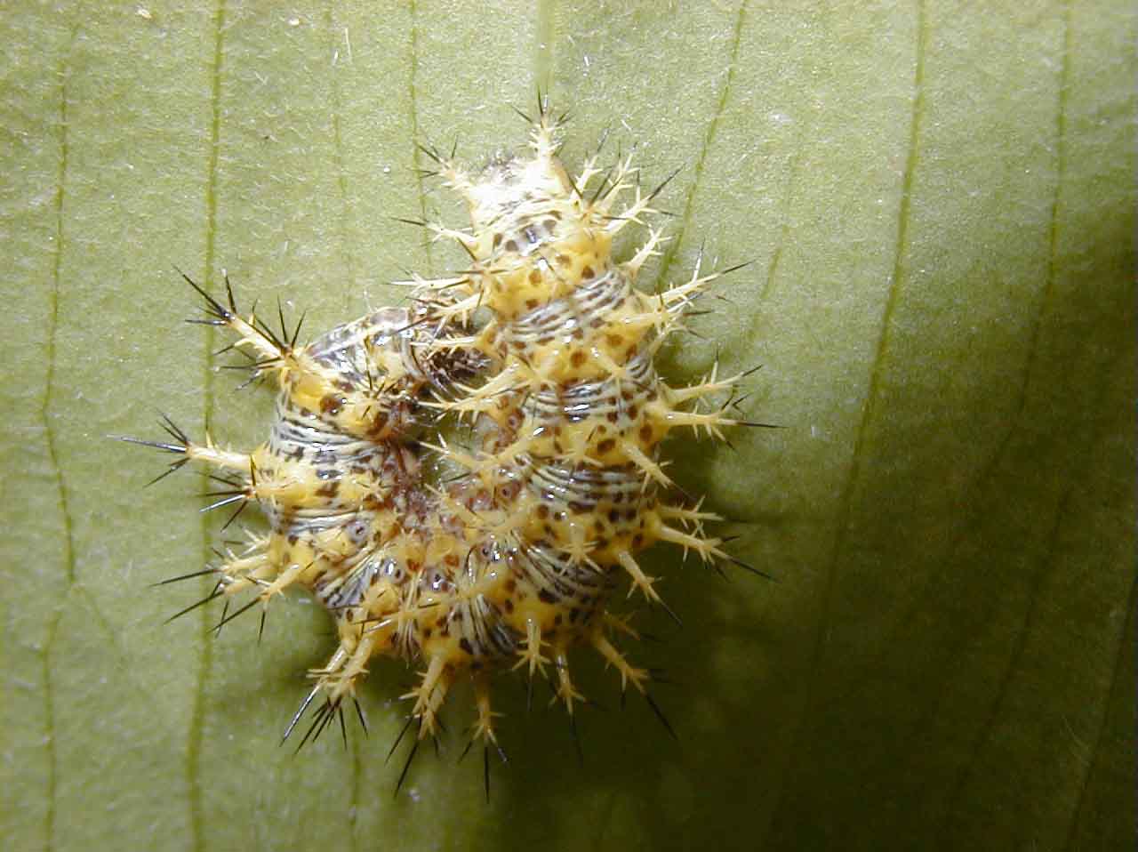幼虫にはイラガのようなとげ状突起が多数あるが毒針はない