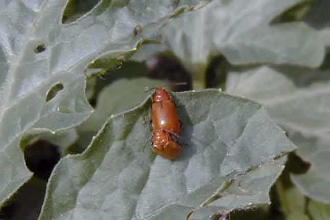 - 成虫は7〜8mmで、全体に橙黄色。年1回の発生で、成虫で越冬する。5月下旬頃、ウリ類が植え付けられると雌成虫が産卵を開始する。卵は株元に産卵され、孵化した幼虫は根を加害する。新成虫は7月下旬〜8月下旬に出現する。
