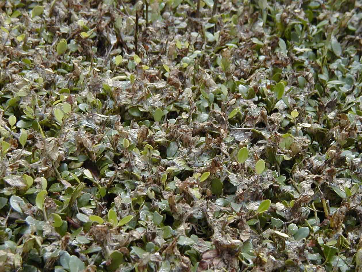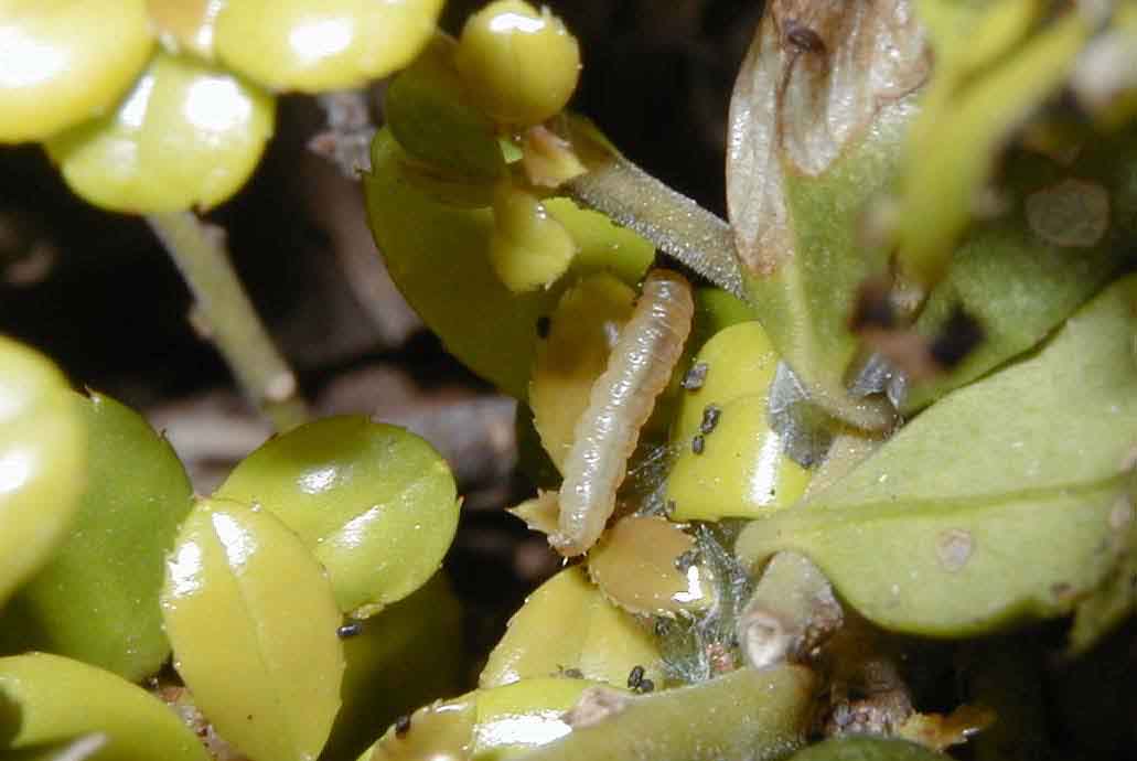 幼虫は新梢の先端の新葉を数枚糸で乱雑につづって、その中を食害する。葉の片面のみを食害するため、ツゲ類では、被害部分が茶褐色に枯れ、著しく美観を損ねる。つづった葉の中の幼虫は、初め暗褐色であるが、長さ8〜9mmの老熟幼虫は暗黄色になる。4月下旬から10月下旬まで連続的に数回不規則な発生を繰り返し、9月下旬から10月下旬に越冬卵が産まれ、そのまま休眠に入り翌年4月下旬