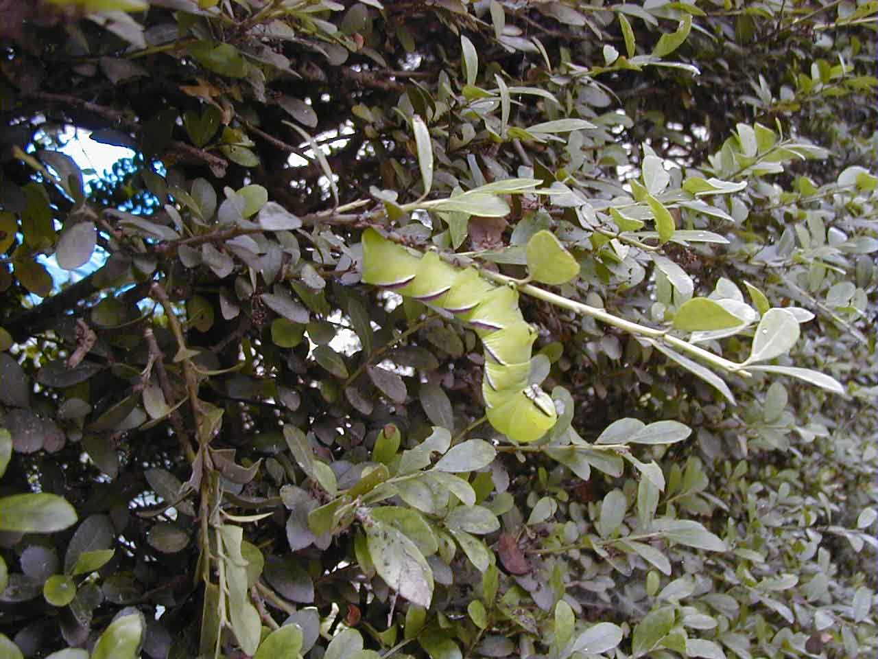 - 頭にある太く黒いすじと、胴にある7本の赤紫の斜め模様が特徴的である。年に2回の発生で、幼虫は、7月と9〜10月に見られる。1960年代後半から、東京都区内などで、生垣や庭のイヌツゲ(モチノキ科)で多く見られるようになった。