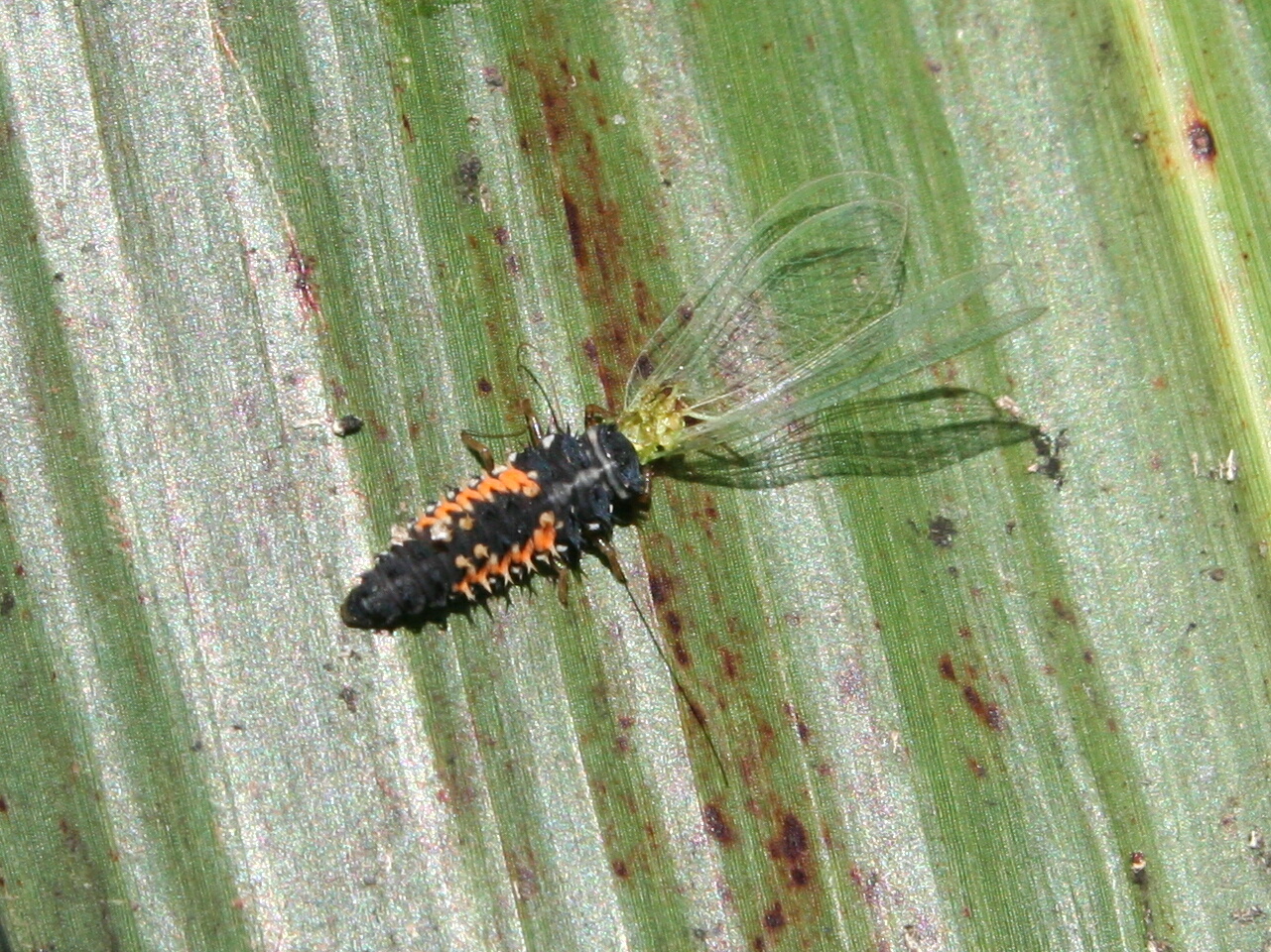 ソルゴー葉上で、ナミテントウの幼虫が クサカゲロウ科の一種の成虫を捕食 |