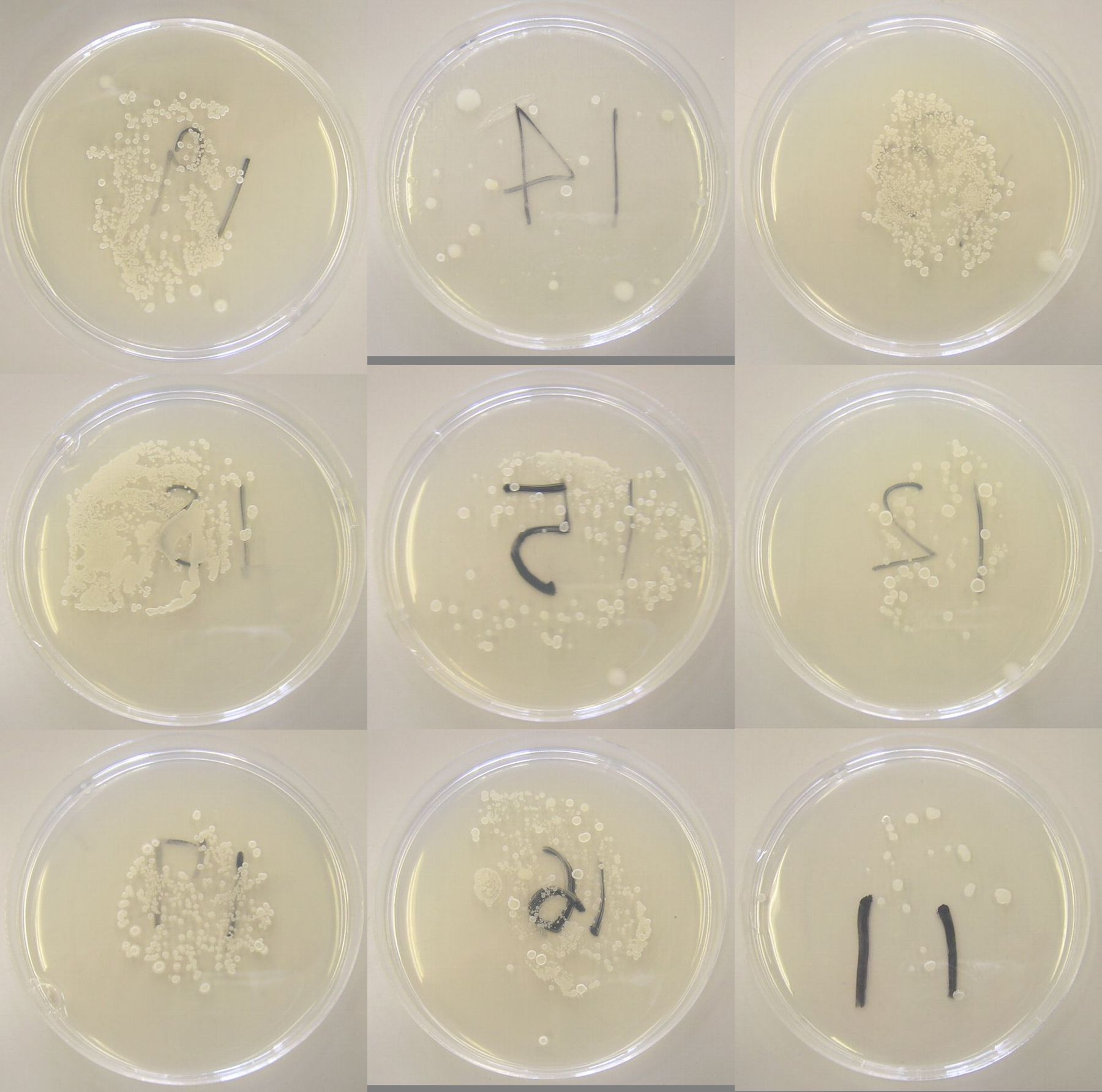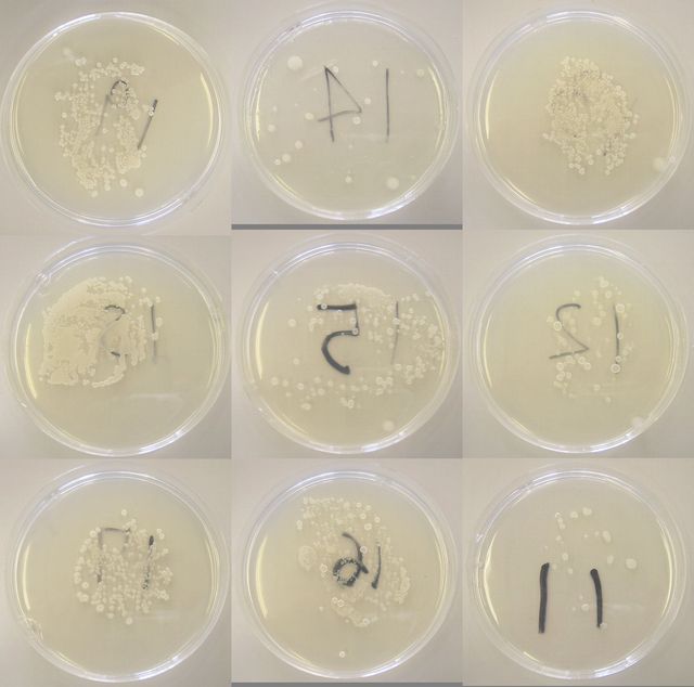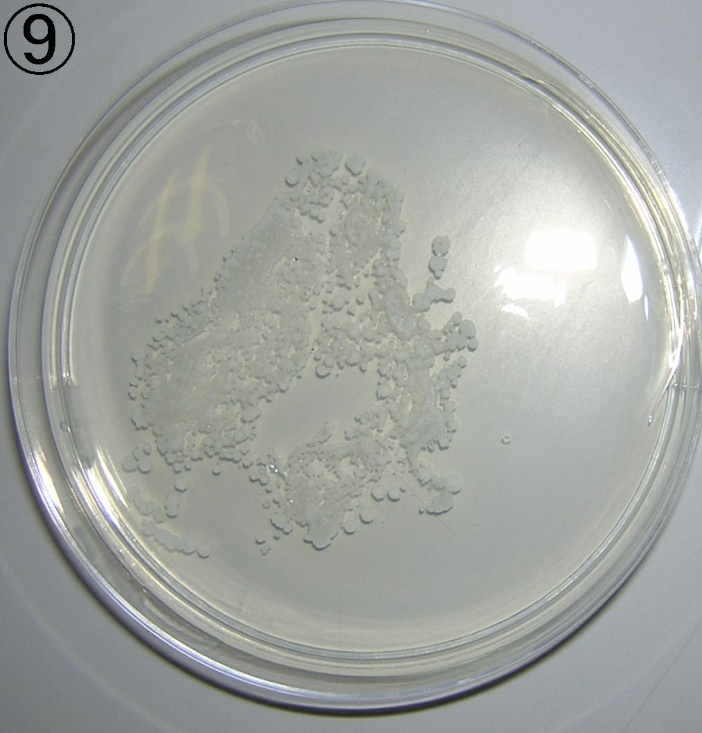 - 1/31(木)の9時頃に胸の高さの小葉(先端部分)を培地に押しつけるスタンプテスト。培養は35℃24時間。